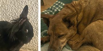 El perro se llama Rocky y la coneja Miss. Hace 12 y 11 años fueron adoptados para crear la familia que hoy somos. Se llevan estupendamente: Rocky quiere jugar con ella, protegerla y lamerla, pero Miss considera que es un poco pesado. Rocky es algo desconfiado, pero solo quiere protegernos, pudiendo ...