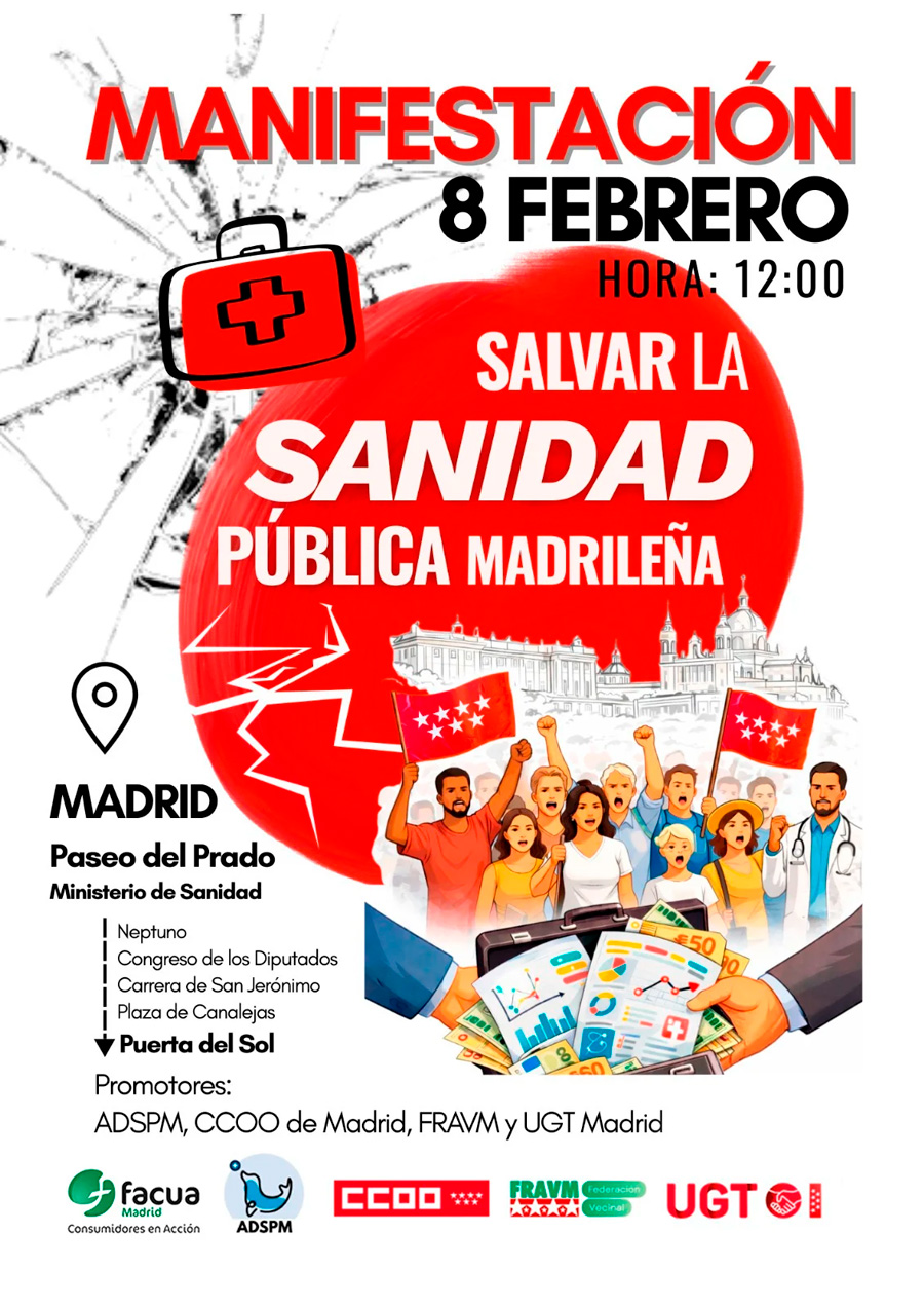 FACUA Madrid se suma e invita a toda la ciudadanía madrileña a participar en la manifestación de este domingo 8 de febrero en defensa de la sanidad pública de la región.
