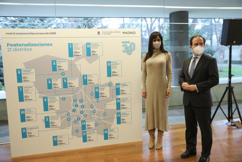 Madrid cambiará su fisonomía desde este mes para convertir 203.440 m2 en espacio cero emisiones de manera definitiva, una superficie equivalente a 18 veces la Puerta del Sol (10.900 m2). Esta transformación será posible gracias a la conversión de 10 kilómetros lineales de calzada, por donde actualmente circulan vehículos, en tramos peatonales. La vicealcaldesa de Madrid, Begoña Villacís, junto al delegado de Medio Ambiente y Movilidad, Borja Carabante, y la delegada del Área de Obras y Equipamientos, Paloma García Romero, ha presentado esta mañana, en los Jardines de Cecilio Rodríguez, las 21 peatonalizaciones que se llevarán a cabo progresivamente desde diciembre y hasta principios de año y que afectan a 48 tramos de los 21 distritos de la capital. Estas actuaciones eliminarán de todas estas zonas 14,6 millones de vehículos anuales, 40.000 vehículos al día.