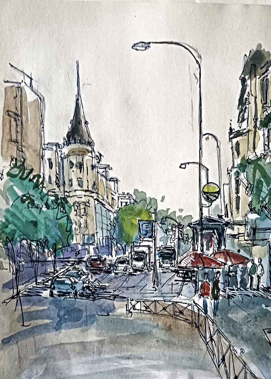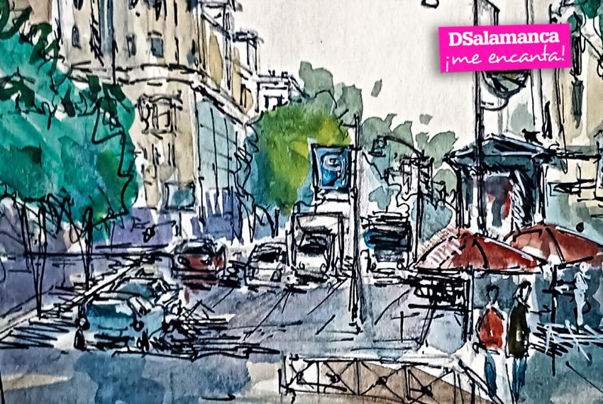 En el lado derecho de la bellísima acuarela de este mes podemos ver el edificio del número 151 de la calle de Alcalá, que hace esquina con la calle del Conde de Peñalver. Construido en 1947, tiene 757 m² de parcela y nueve plantas, con tres vecinos por planta. Un total de 22 viviendas, además de siete comercios y tres oficinas.