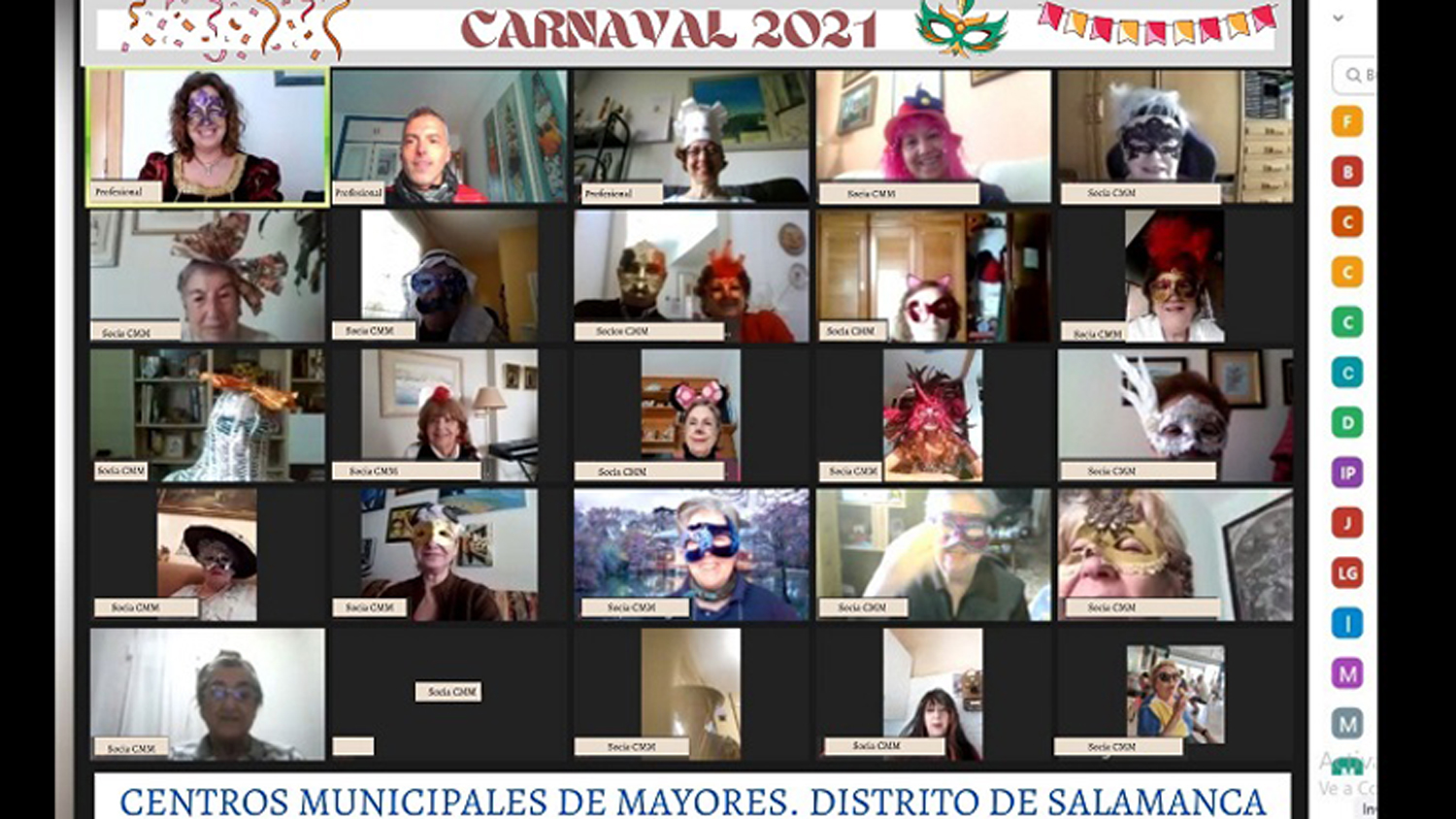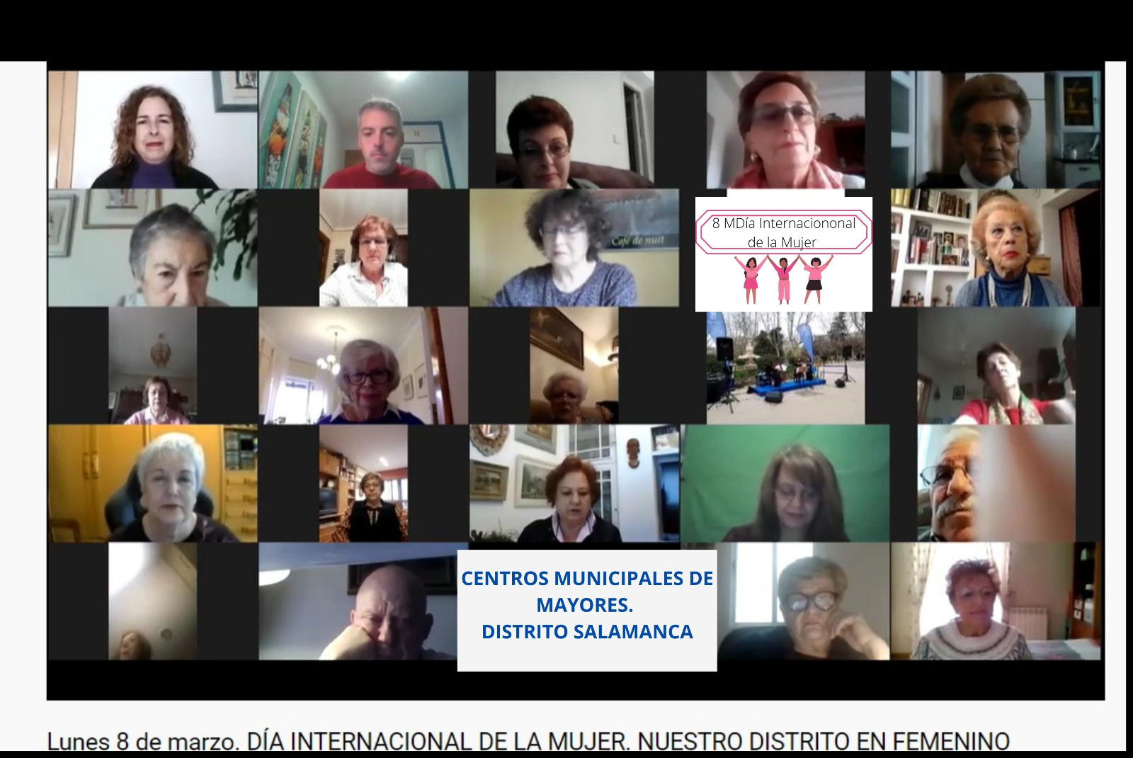 Durante estos meses, se ha realizado una programación especial sociocultural por el personal de los centros municipales de mayores de Salamanca, a través de los vídeos y Zoom. En todas las actividades se ha contado con la participación del concejal del distrito de Salamanca, José Fernández, que siempre ha tenido palabras de ánimo y cariño hacia los mayores, como en las celebraciones de la semana especial de fin de curso de junio de 2020, Navidad y Carnaval, la programación especial del 25N, Día Internacional de la Violencia de Género, y los actos con motivo del 42 aniversario de la Constitución (junto con el distrito de Centro). La última de ellas, ha sido el pasado día 8 de marzo con motivo del Día Internacional de la Mujer, donde se ha realizado un encuentro vía Zoom titulado Madrid directo: Nuestro distrito en femenino, una oportunidad para que las diferentes personas mayores compartieran la historia de mujeres que dan nombre a calles o edificios del distrito, mujeres, como subrayó José Fernández, “que han hecho historia en Madrid y que han marcado el camino para que la sociedad avance”.