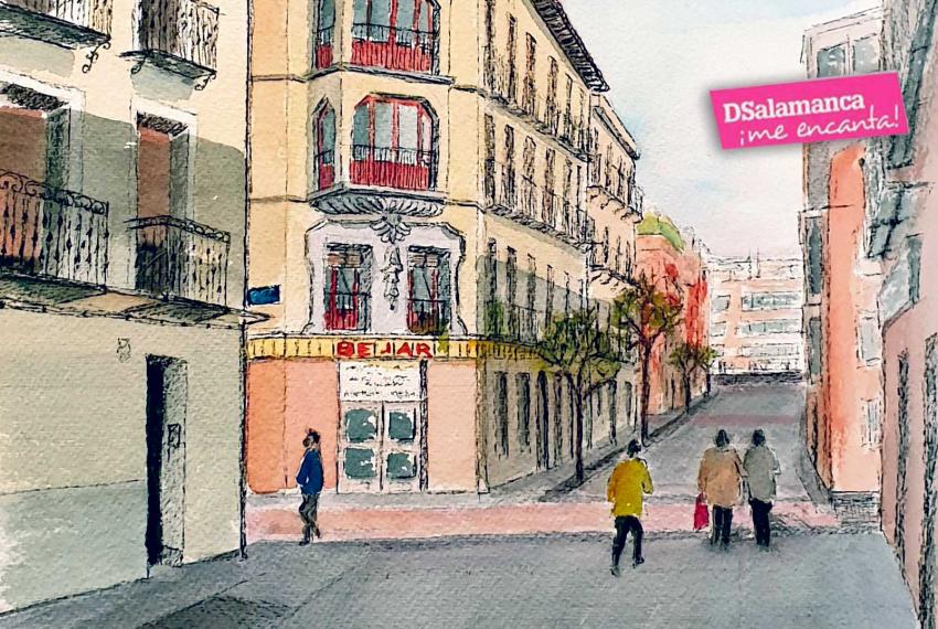 La calle Béjar, ubicada en el barrio de Guindalera y recientemente peatonalizada, es la primera calle que cruza directamente desde la calle de Francisco Silvela hasta la de Cartagena, motivo por el cual es muy transitada por el vecindario. En la bella acuarela de nuestro colaborador José Alberto de Mingo podemos verla a la altura del número 23, en su esquina con la calle del Pilar de Zaragoza, edificio de 1925 en el que se ubica un negocio de saneamientos que lleva en el barrio desde 1947.