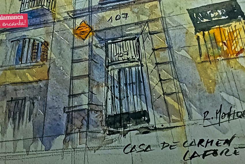 En la casa que vemos en la acuarela de este mes, situada en el número 107 de la calle del General Pardiñas, vivió en 1944 la escritora Carmen Laforet, y justo allí, “mirando hacia Barcelona” (como puede leerse en la placa que hay en el portal) escribió su novela más conocida: Nada.