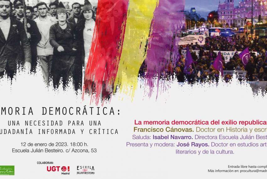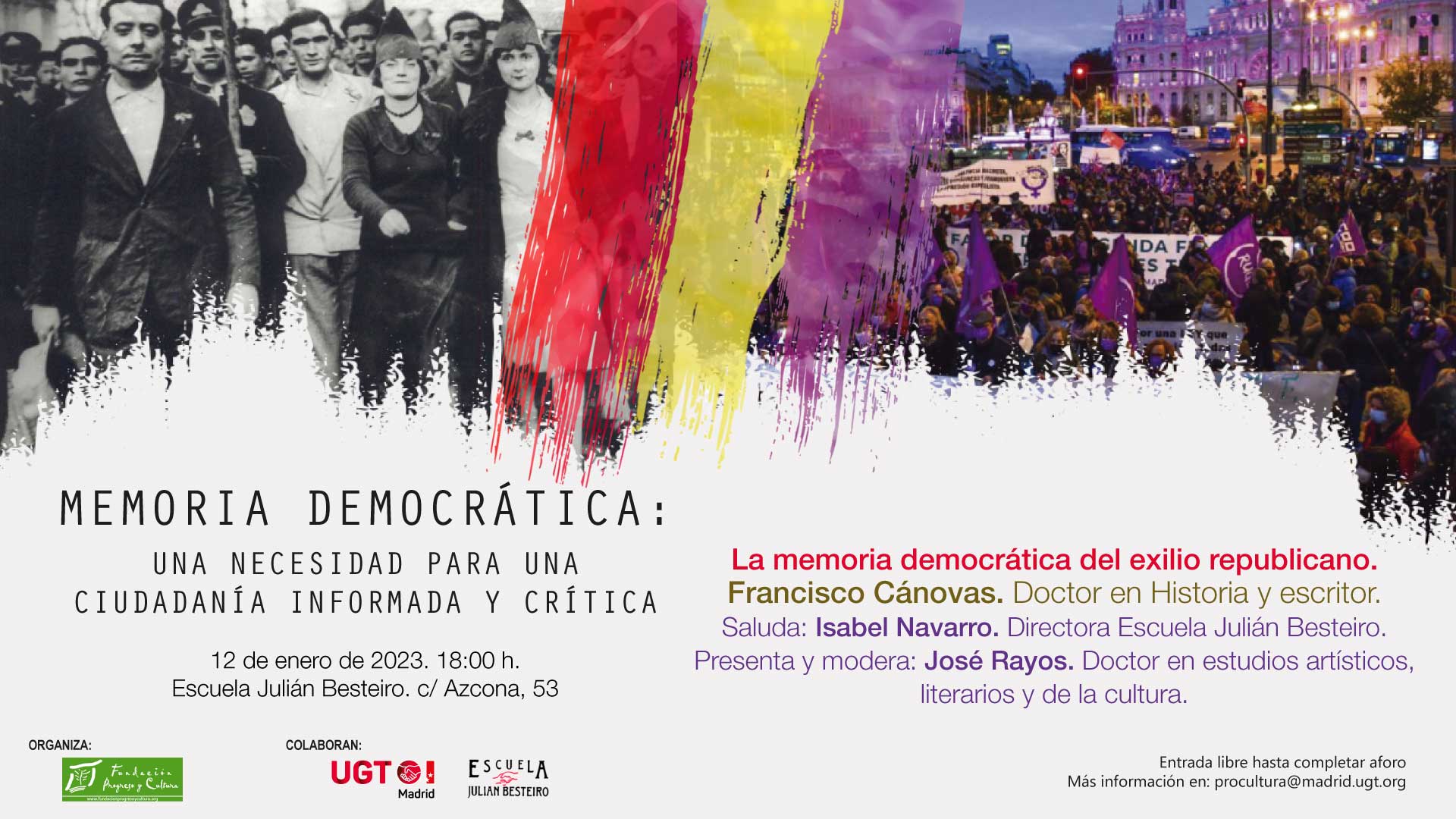El jueves 12 de enero a las 18:00 h, continuamos con el Ciclo Memoria Democrática: una necesidad para una ciudadanía informada y crítica, organizado por la F. Progreso y Cultura, con la colaboración de UGT-Madrid y la Escuela Julián Besteiro.