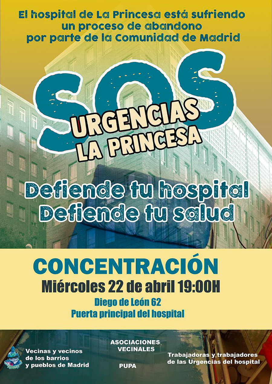 Trabajadoras y trabajadores del Hospital Universitario La Princesa, junto a asociaciones vecinales y plataformas ciudadanas de losdistritos de Salamanca, Chamartín y Ciudad Lineal, y Vecinas y Vecinos de Barrios y Pueblos de Madrid, convocan una concentración el 22 de abril a las19:00 h para denunciar el deterioro creciente de la atención sanitaria y la falta de medidas reales para mejorar la situación del centro.