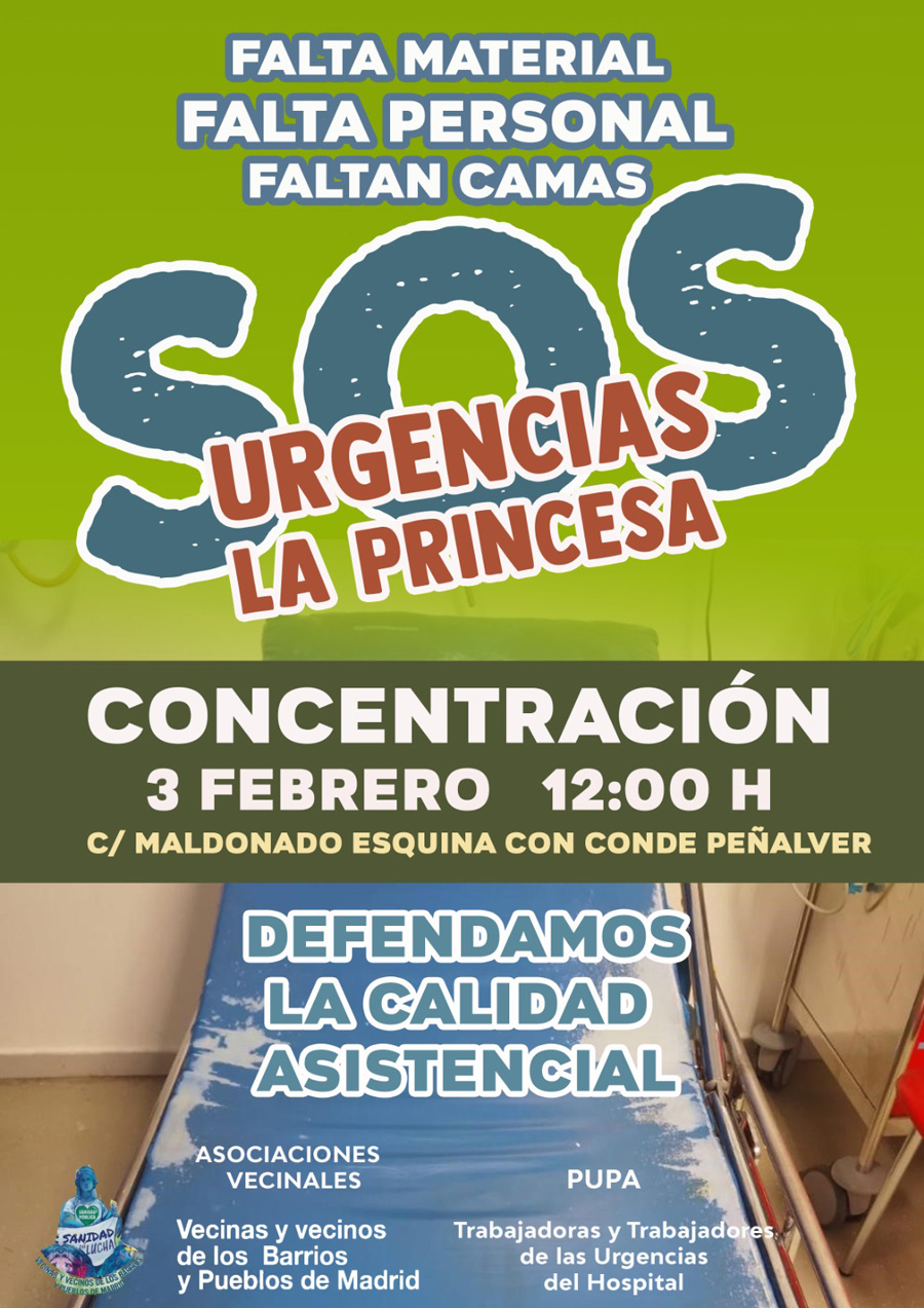 Las trabajadoras y trabajadores, junto a representantes de asociaciones vecinales de los distritos de Salamanca, Chamartín y Ciudad Lineal, plataformas ciudadanas y Vecinas y Vecinos de Barrios y Pueblos de Madrid, convocan una nueva concentración el próximo martes 3 de febrero a las 12 horas frente al Hospital La Princesa. Esta movilización responde al agravamiento del colapso crónico y la degradación de las condiciones en sus Urgencias y en el conjunto del centro sanitario, tras el incumplimiento de los compromisos exigidos en la protesta del pasado 16 de diciembre.