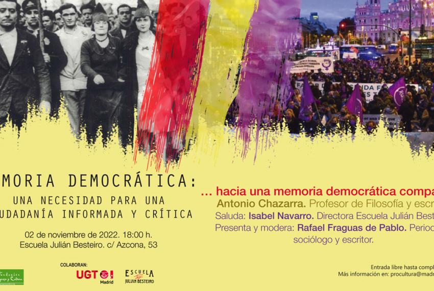El próximo miércoles, 2 de noviembre a las 6 de la tarde, en la Escuela Julián Besteiro, Calle Azcona, 53, continuamos con el ciclo de conferencias sobre Memoria Democrática.