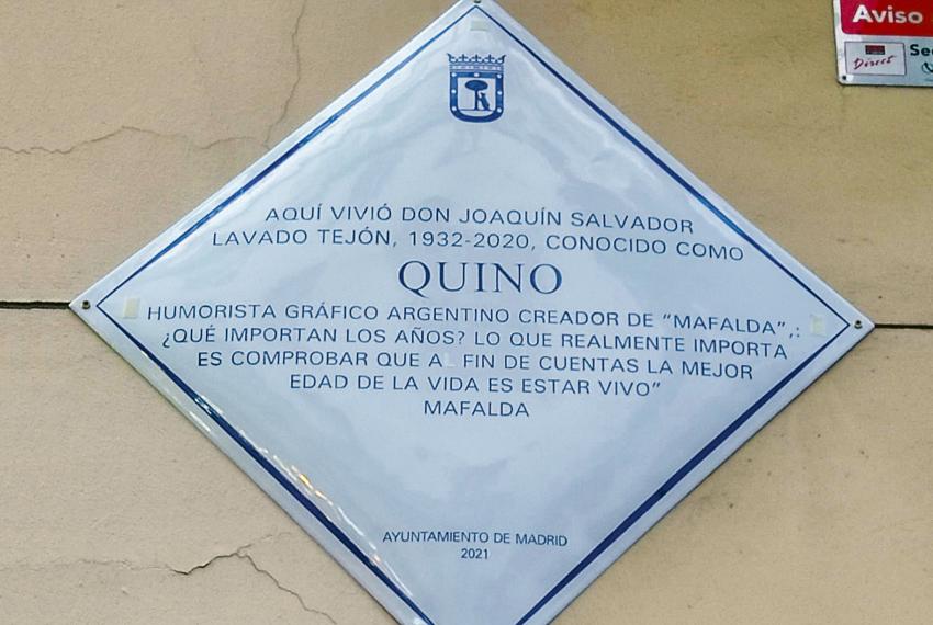 El concejal del Distrito Salamanca, José Fernández, descubría el pasado 4 de noviembre una placa en recuerdo de Joaquín Salvador Lavado, Quino, el dibujante argentino conocido internacionalmente por ser el “padre” de Mafalda. Este homenaje fue acordado en el pleno del Distrito del pasado mes de octubre para reconocer “la labor de este gran humorista gráfico y mostrar el orgullo de que durante un tiempo fuera vecino de nuestro distrito”, ha afirmado Fernández.