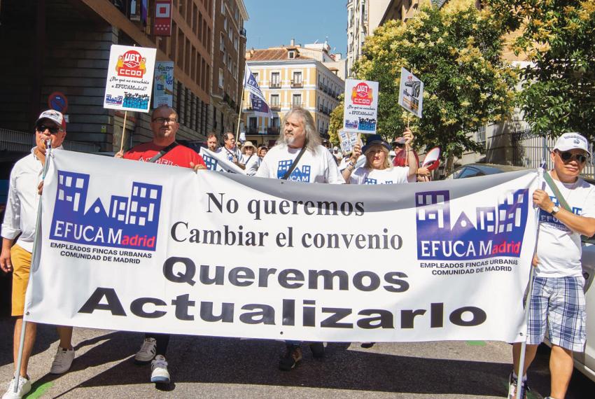 Porteros, conserjes y vigilantes de garaje salen, por primera vez, a las calles de la capital para exigir sus derechos laborales. El centro de Madrid acogió el pasado 25 de junio la manifestación convocada por la asociación EFUCAMadrid (Asociación de Empleados de Fincas Urbanas). Los trabajadores recorrieron el centro de la capital, iniciando su recorrido en la sede de CC OO (C/ Lope de Vega, 38) y finalizando en la sede de UGT (Avda. de América, 25).