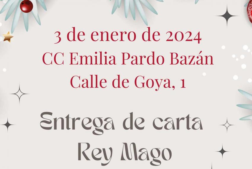 El miércoles 3 de enero, en el Centro Cultural Emilia Pardo Bazán (calle Goya 1 A) y en horario de 11h a 14h y de 17h a 19h, contaremos con la presencia un Rey Mago y un Paje Real que recogerán las cartas con los deseos de pequeños y mayores.