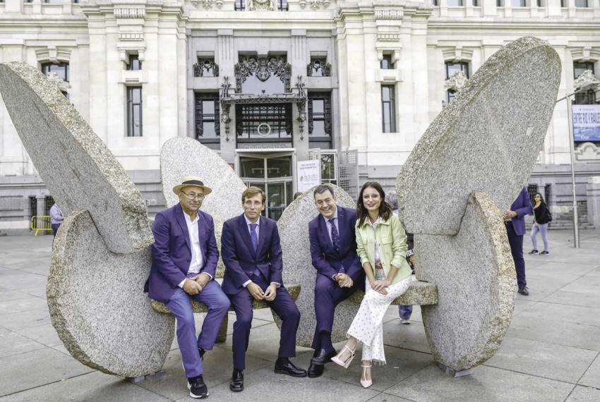 El alcalde de Madrid, José Luis Martínez-Almeida, acompañado por la delegada del Área de Cultura, Turismo y Deporte, Andrea Levy; el consejero de Cultura, Educación, Formación Profesional y Universidades de la Xunta de Galicia, Román Rodríguez; y el propio artista, recorrían el 7 de octubre un tramo del paseo del Prado para conocer algunas de las esculturas de la muestra.