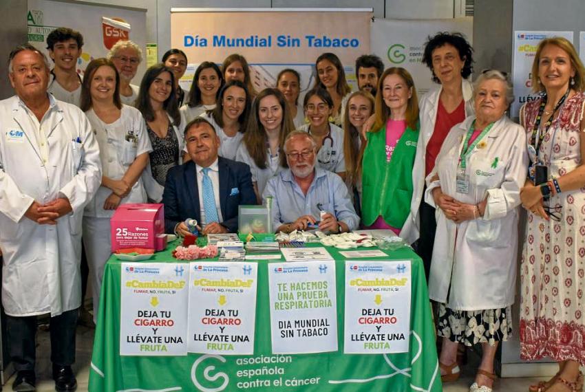 El Comité de Prevención del Tabaquismo del Hospital Universitario de La Princesa, centro público de la Comunidad de Madrid, ha celebrado el Día Mundial sin Tabaco en colaboración con la Asociación Española Contra el Cáncer (AECC) con la realización de diferentes actividades bajo la iniciativa #CambiaDeF que motiva el cambio de la “F” de Fumar por la “F” de Fruta. Bajo esta premisa se intercambiaron manzanas y peras por cigarrillos, y el Servicio de Neumología realizó a las personas interesadas pruebas respiratorias para medir la capacidad y funcionamiento de los pulmones (espirometrías).