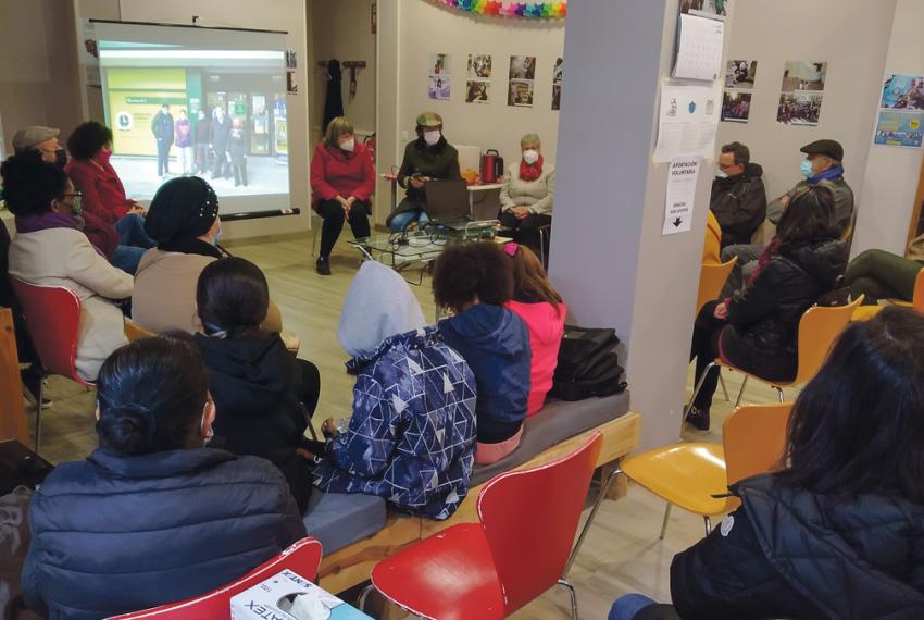 Se explicó lo que fue la Red de Cuidados, dedicada a hacer encargos a personas vulnerables o contagiadas en el periodo de confinamiento general, hasta que la necesidad hizo que se crease la despensa inicial, organizada y sustentada por personas voluntarias, que evolucionó hasta la despensa autogestionada por las propias familias usuarias.