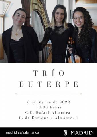 Mañana, día 8, a las 18:00 h, el Centro Cultural Quinta del Berro-Rafael Altamira acoge el concierto del Trío Euterpe, una formación integrada por mujeres jóvenes miembros de la Orquesta y Coro de Cámara Sonora, que realizará un recorrido por el mundo a través de la música de distintas épocas y países.