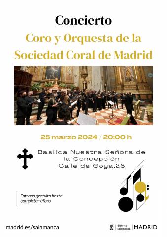 A las 20:00 h, disfrutaremos del concierto especial de Semana Santa a cargo del Coro y la Orquesta de la Sociedad Coral de Madrid.