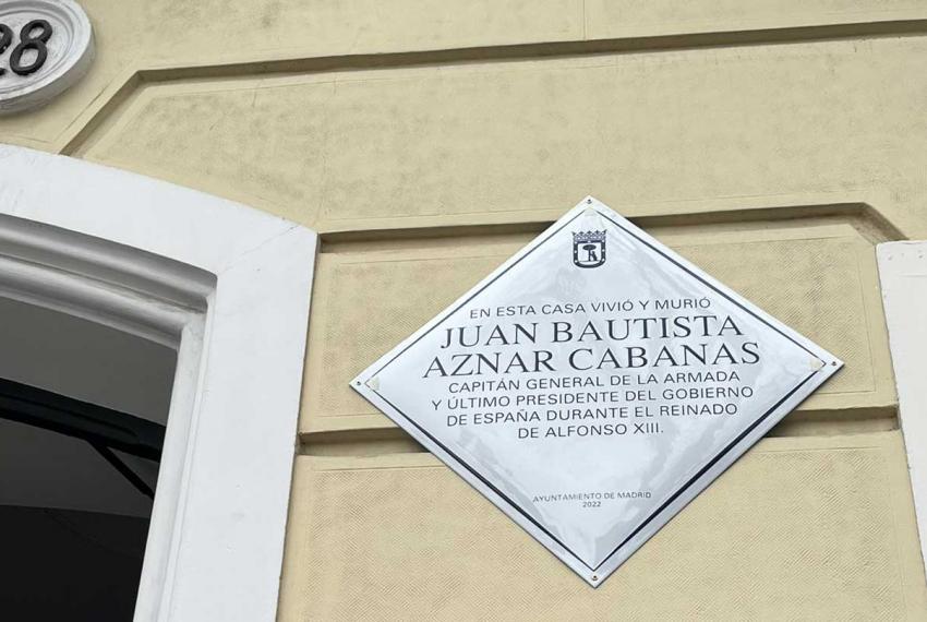 El concejal del distrito Salamanca, José Fernández, ha descubierto hoy una placa en homenaje a Juan Bautista Aznar y Cabanas, último presidente de Gobierno del reinado de Alfonso XIII. La placa se ha instalado en la calle de Serrano 28, donde el militar y político residió los últimos años de su vida, alejado ya de la actividad profesional y política y donde falleció en febrero de 1933. Este reconocimiento fue acordado de forma unánime por el Pleno de la Junta Municipal de Salamanca del pasado mes de septiembre.