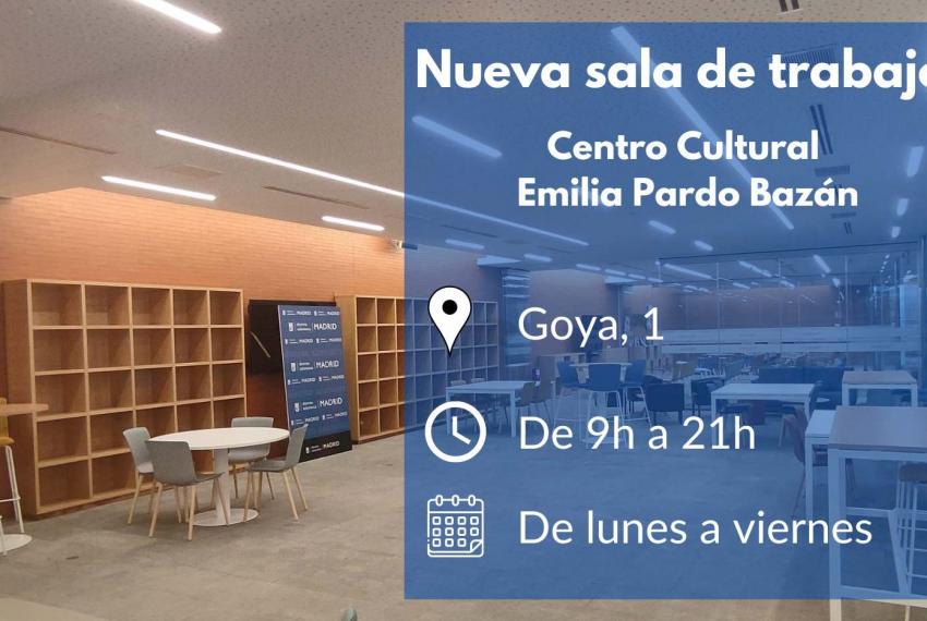 El espacio disponible en el CC Emilia Pardo Bazán es una amplia sala, de unos 70 metros cuadrados, conformada como espacio de trabajo, donde puedes trabajar de forma cómoda, sin ruido y con conexión Wifi. Además, dispone de numerosos puntos de luz para que puedas conectar tus dispositivos en toda la estancia. Su mobiliario está compuesto por 29 sillas, tres sofás de tres plazas y dos sillones, que conforman un espacio total de 45 plazas, distribuidas en 11 mesas de diferentes alturas y tamaños, alrededor de las cuales es posible mantener reuniones o trabajar en grupo.