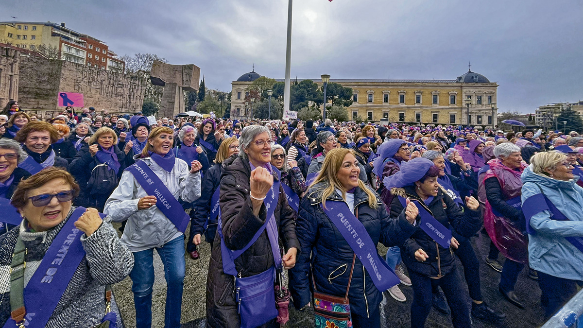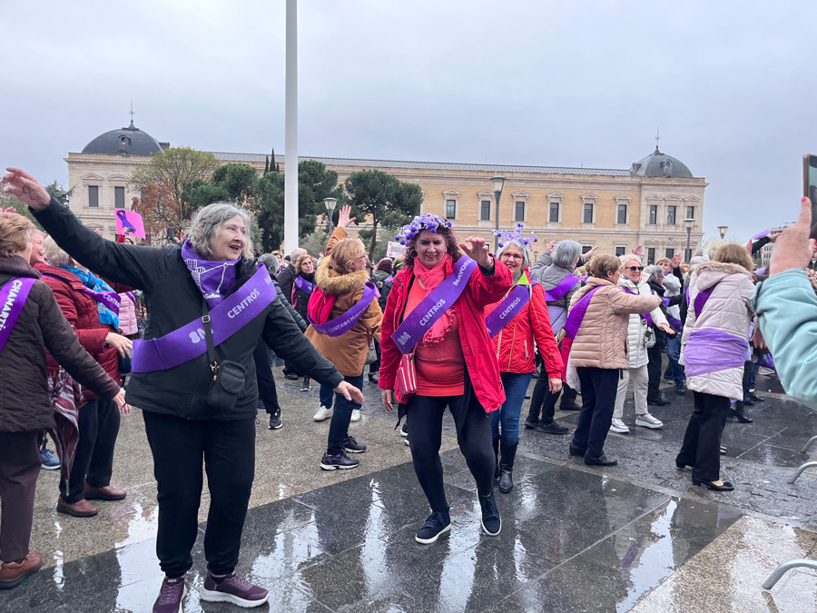 Mujeres usuarias de los centros municipales de mayores de los 21 distritos madrileños se dieron cita en la plaza de Colón para participar en el tradicional baile del Día Internacional de la Mujer. Con este flashmob, que organiza el Ayuntamiento cada año para conmemorar el 8 de marzo, han reivindicado la igualdad y la visibilidad de las mujeres mayores en el espacio público.
