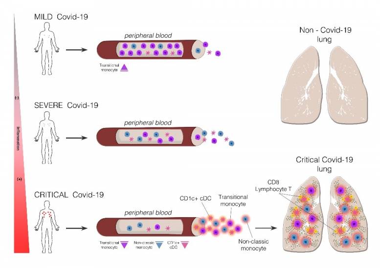 La revista Journal Clinical of Investigation publicó el pasado mes de agosto un estudio cuyos autores son investigadores del Instituto de Investigación del Hospital Universitario de La Princesa (IIS Princesa), que se ha centrado en identificar los tipos celulares de sistema inmunitario innato que se afectan diferencialmente en la sangre de pacientes COVID-19 con distintos grados de severidad. Los resultados han indicado que en pacientes COVID-19 críticos que necesitan ser ingresados en UCI y recibir soporte respiratorio, ocurre una reducción de células dendríticas CD1c y monocitos inflamatorios (no clásicos y tradicionales) de la sangre. Estas mismas poblaciones celulares se encuentran muy enriquecidas en los infiltrados bronquiales de estos pacientes COVID-19 críticos, y presentan un elevado grado de activación. Además, se ha visto que la presencia de estas células está asociada a respuestas inmunes celulares de células T CD8+ en el pulmón. Por último, se ha observado que en pacientes COVID-19 leves se produce un aumento de monocitos transicionales en sangre, indicando que un incremento de estas células en circulación podría ser un biomarcador de buen pronóstico de la enfermedad.