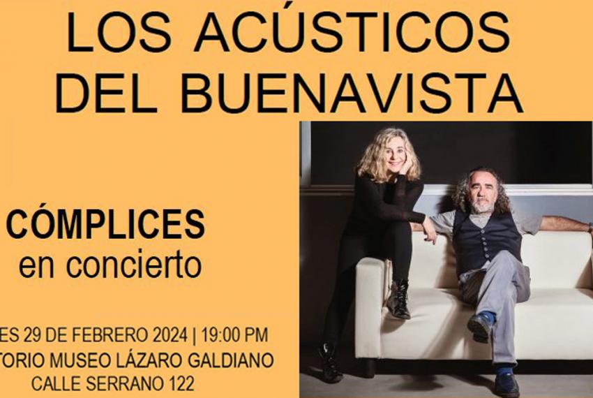 Por quinto año consecutivo, la Junta Municipal del Distrito de Salamanca organiza el ciclo de conciertos Los Acústicos del Buenavista. El dúo Cómplices será el encargado de abrir esta temporada el próximo jueves, día 29, a las 19:00 h, con un repaso a su dilatada carrera, iniciada a finales de los años 80 del pasado siglo, en el que no faltarán grandes éxitos como Ángeles desangelados, La danza de la ciudad, Es por ti o Está llorando el sol,además de temas de su último álbum Llámame, publicado en 2023.