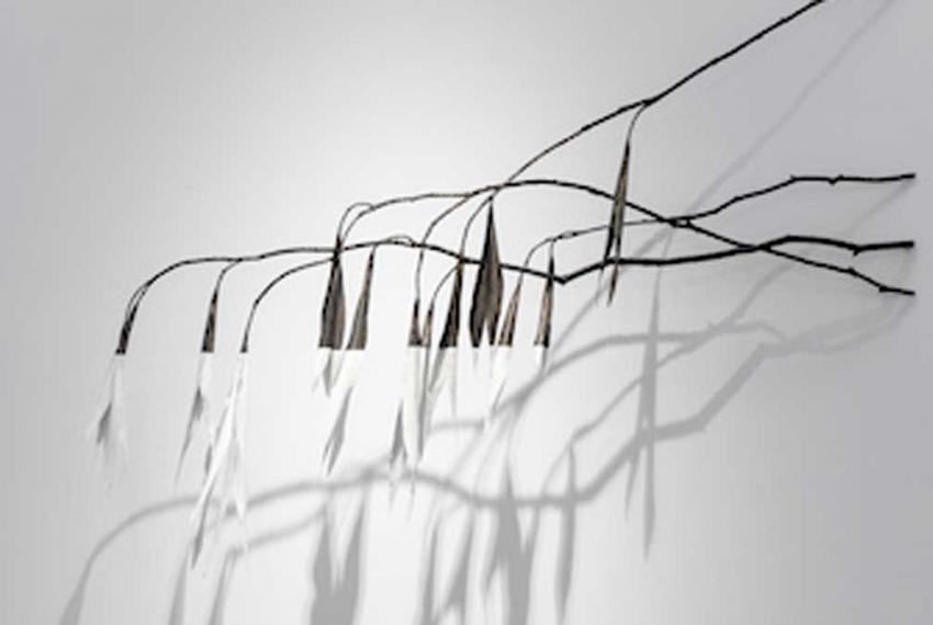Su lenguaje artístico tiene un pie en la Naturaleza y el otro en el sueño, transmite el aliento de la poesía generando arquitecturas de sombras. En su mirada poética lo real está fundido con lo virtual, sus ritmos visuales sortean la melancolía para ofrecernos cristalizaciones del tiempo, instantes de plenitud. Un auténtico soplo de aire fresco dinamiza sus composiciones y, al mismo tiempo, nos reanima. “¿Por qué milagro de la forma material –se pregunta Michael Bohbot-, en condiciones de hilo de hierro, presa de la gravedad, se vuelve tan ligera como un hilo de luz? La respiración. La línea de Cristina Almodóvar respira, evoca el soplo; su respiración se une a la nuestra. El ojo posee también su propio pulmón, un pulmón y un corazón cuyos latidos nos permiten ver, entender y actuar, y todo ello al ritmo del universo. Cristina Almodóvar proporciona soberanía a la mirada”. Respiración e inspiración, materia pesada que se torna leve, naturaleza modulada artísticamente que nos invita a la serena contemplación como si estuviéramos frente al toko no ma.