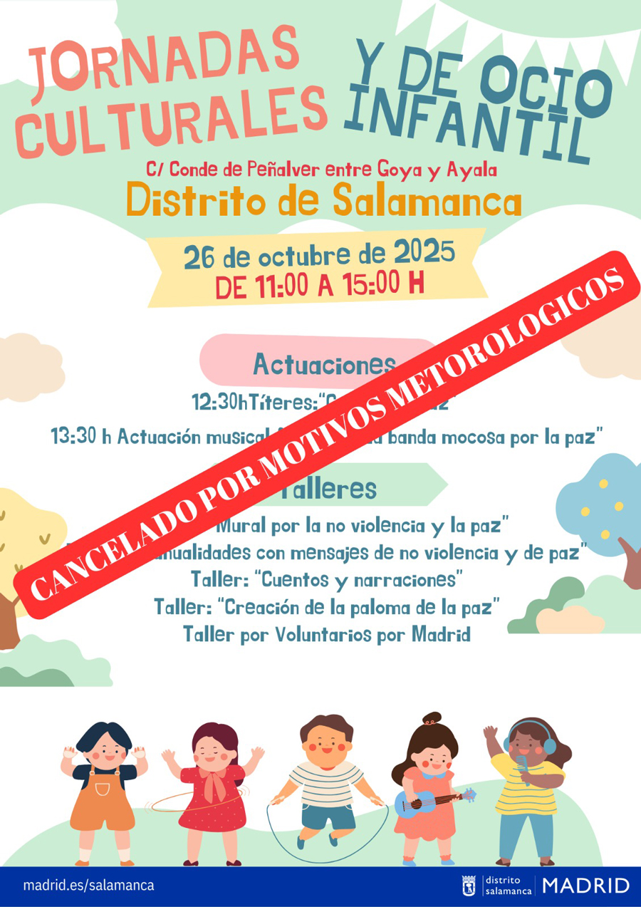 Lamentamos tener que comunicar la cancelación, por condiciones meteorológicas adversas, de la Jornada Cultural y de Ocio Infantil: Día Internacional de la No Violencia y la Paz, prevista para el domingo 26 de octubre