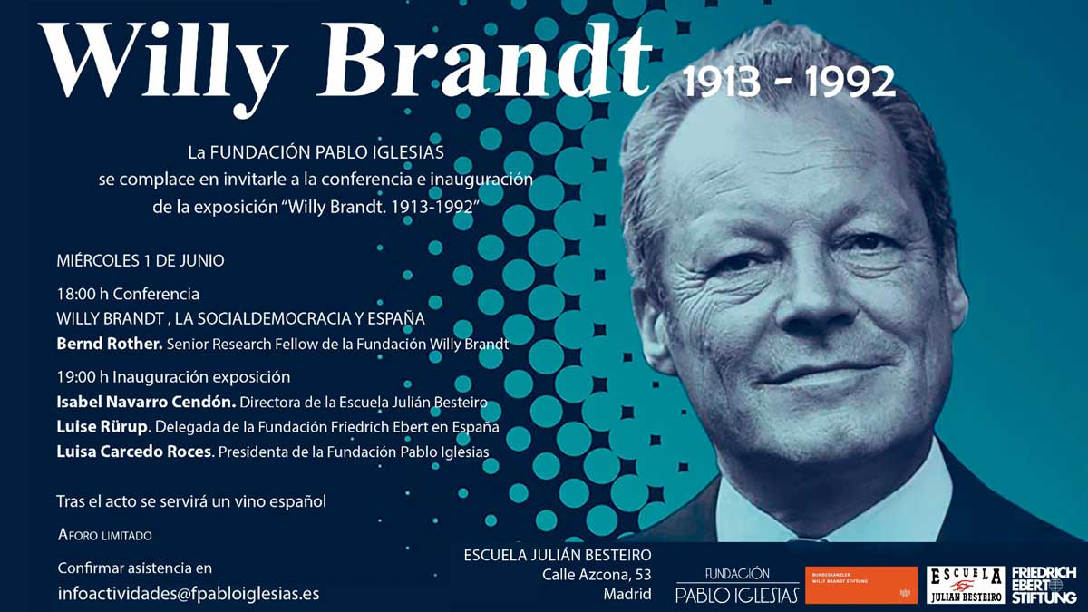 El miércoles 1 de junio en la Escuela Julián Besteiro, a las 18:00 h, Bernd Rother pronunciará la conferencia “Willy Brandt, la socialdemocracia y España” y a las 19:00 h se inaugurará la exposición Willy Brandt. 1913-1992. Una vida por la libertad, la paz y la reconciliación entre las naciones.