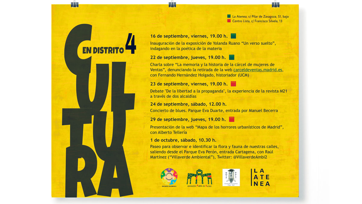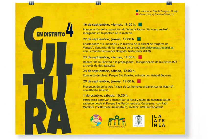 Con Cultura en Distrito 4 queremos alejarnos del estereotipo de barrio de compras y terrazas. Las vecinas y vecinos de este distrito queremos ser protagonistas de la vida cultural del mismo, buscamos la participación y demostramos con nuestras actividades habituales (charlas, debates, además de propuestas y preguntas a la Junta Municipal) nuestro interés en las decisiones que nos afectan y nuestra disposición a buscar las mejores propuestas para resolver los inevitables problemas de la adaptación del diseño urbano a una sociedad cambiante.