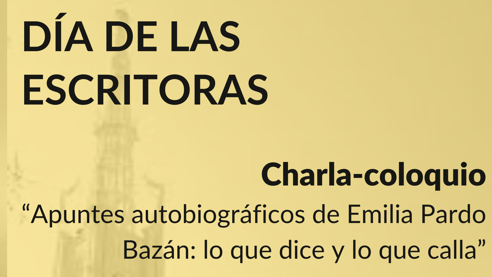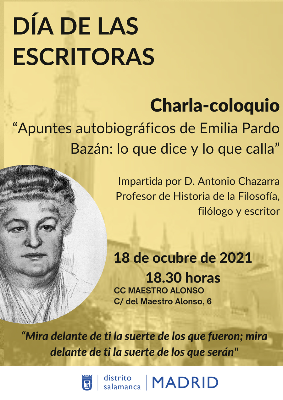 Con motivo del Día de las Escritoras, el lunes, 18 de octubre a las 18:30h, en el Centro Socio-Cultural Maestro Alonso, tendrá lugar la Charla-coloquio “Apuntes autobiográficos de Emilia Pardo Bazán: lo que dice y lo que calla”, a cargo de Antonio Chazarra, profesor de Historia de la Filosofía, filólogo y escritor.