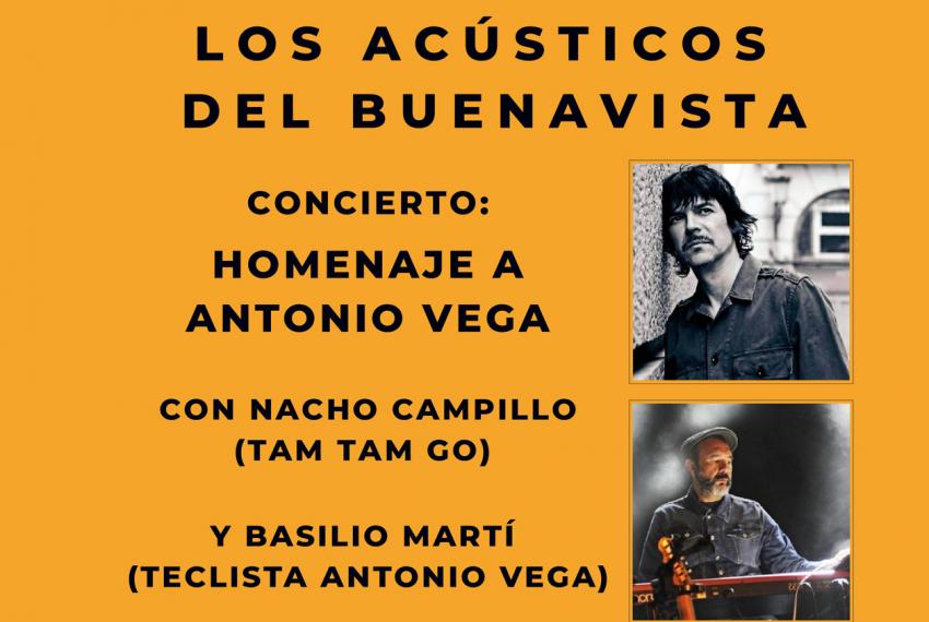 Los Acústicos del Buenavista rinden homenaje, en el decimosexto aniversario de su desaparición, a uno de los compositores más importantes de la música española: Antonio Vega, y lo hacen de la mano de Nacho Campillo (líder de Tam Tam Go!) y del que fuera pianista de Vega durante más de veinte años: Basilio Martí.