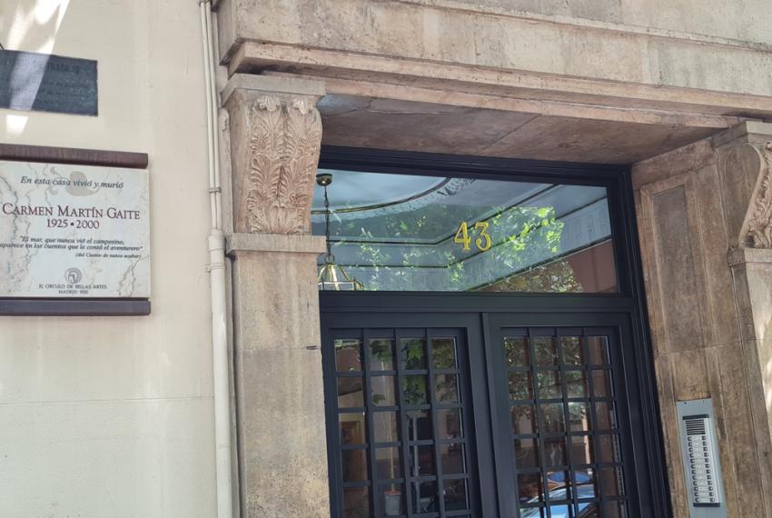 La concejala de Salamanca, Cayetana Hernández de la Riva, con la placa conmemorativa homenaje a Carmen Martín Gaite en el lugar donde vivió la escritora