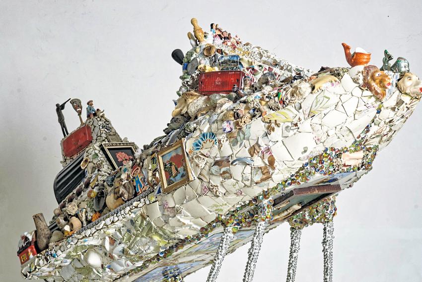 La pieza central de la muestra es El mar interior, una acumulación de miles de fragmentos que, como él dice, “se le han quedado pegados por el camino” y cuya elección (“elegir es crear”, declara) surge por gusto, por identificación, alentada por un proceso apropiativo de falsa arqueología cargada de una historia sedimentada de búsqueda, de encuentro, de recolección. “Todo ello con una intención de resignificar cada objeto al ordenarlo en una estructura más grande mediante técnicas de ensamblaje y collage. Como si participara de un mecanismo de destrucción, creación, alquimia”, explica Milicua, al que algunos califican de barroco, aunque sus mayores influencias provengan del surrealismo daliniano, el pop art, la estética neoexpresionista y los tebeos. En el comienzo de su trayectoria creó el Grupo Barroco Psicodélico junto a otros compañeros y pintó el techo de la discoteca Gaueko de Bilbao, templo del afterpunk vasco. A finales de los ochenta, su obra adquirió un carácter objetual y escultórico, que desemboca hoy en sus trabajos de mosaico y acumulación, denotando un estilo muy personal. “Siempre me ha interesado la definición del artista como territorio, como país”. Una topografía mental que queda descrita a modo de paisaje y de autorretrato en la instalación del Museo Lázaro Galdiano.