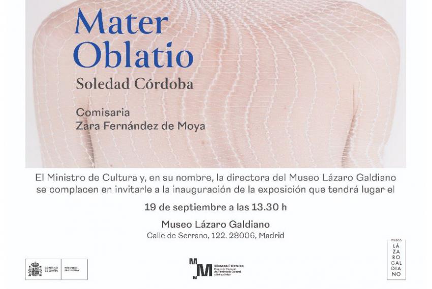 El Ministerio de Cultura inaugura en el Museo Lázaro Galdiano la exposición "Mater Oblatio" de la artista Soledad Córdoba. La muestra, organizada por Museos Estatales en el marco de su línea de trabajo de promoción del arte contemporáneo, podrá visitarse hasta el 24 de noviembre. La artista reflexiona en este proyecto, comisariado por Zara Fernández de Moya, sobre la construcción de la maternidad con imágenes que transitan desde su representación más habitual de cuidados y protección, hasta aquellas que muestran el miedo o el cansancio durante la fase de crianza.