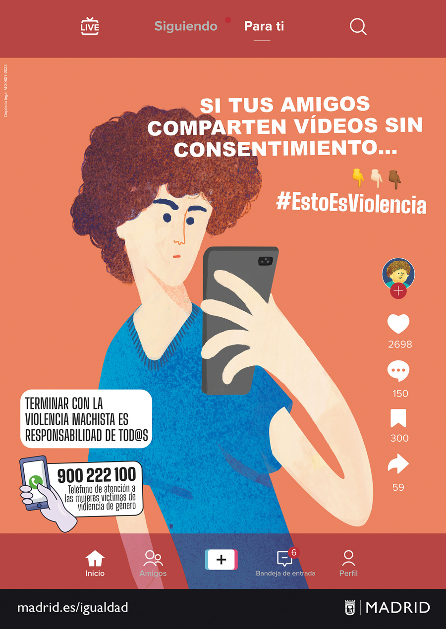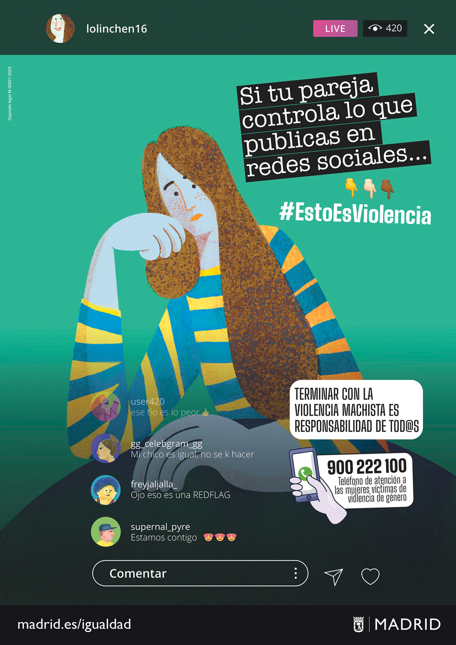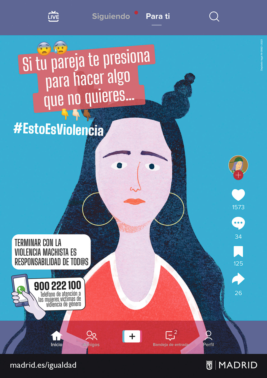 Asimismo, constata que las nuevas tecnologías constituyen un importante foco de exposición a la violencia de género. El 43% de las jóvenes encuestadas se identifican como víctimas de acoco sexual online y un 15% admite haber sido controlada a través del móvil. Por ello, la campaña del Ayuntamiento de Madrid presenta una estética similar a la de las redes sociales con mensajes que aluden a situaciones de acoso y control relacionadas con su uso.