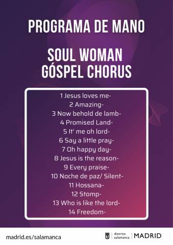 SOUL WOMAN GÓSPEL CHORUS es una formación de gran versatilidad. Apoyándose en la fuerza de sus voces, defiende con maestría, una tras otra, todas las piezas de su cuidado repertorio, usando para ello en sus actuaciones tanto el canto coral a CAPELLA como el acompañamiento de piano o banda, siempre junto a instrumentistas del más alto nivel.