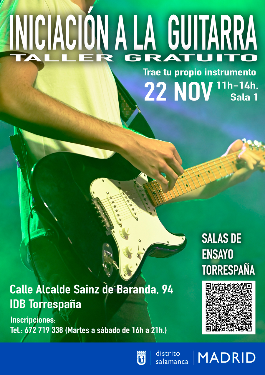 Tenemos el placer de anunciaros el taller gratuito de iniciación a la guitarra que se impartirá en los locales de ensayo de Torrespaña, el día 22 de noviembre, entre las 11h y las 14h.