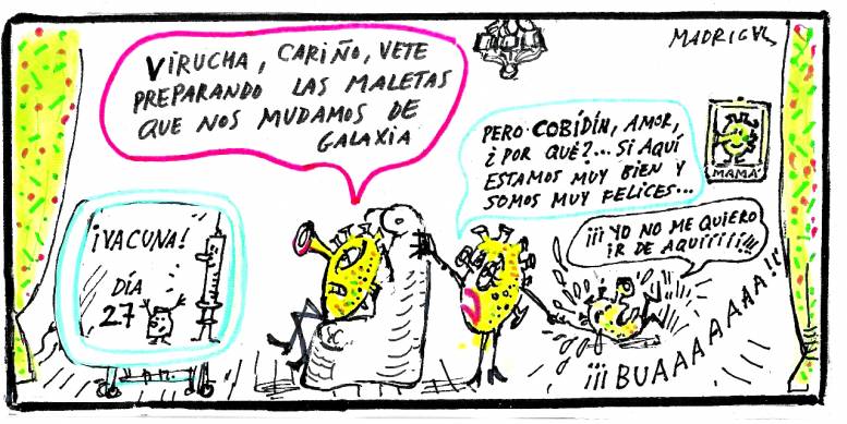 ¿Se da cuenta? Primero le hicieron un PCR, y como salió positivo, tuvo que medicarse regularizando su salud con la Agencia Tributaria; después, como no existían todavía las vacunas, por más ilusión que le hiciera no pudo venir a pasar las Navidades con su familia, que su familia estaba perimetrada…