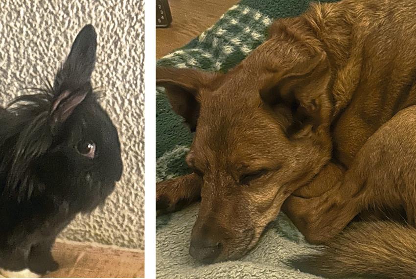 El perro se llama Rocky y la coneja Miss. Hace 12 y 11 años fueron adoptados para crear la familia que hoy somos. Se llevan estupendamente: Rocky quiere jugar con ella, protegerla y lamerla, pero Miss considera que es un poco pesado. Rocky es algo desconfiado, pero solo quiere protegernos, pudiendo parecer un poco gruñón. Miss es muy cotilla y traviesa: se ha quemado bigotes con velas y ha subido hasta la mesa para robar fruta e incluso yogur, llegando a aterrizar en una tortilla o un cuenco de sopa.