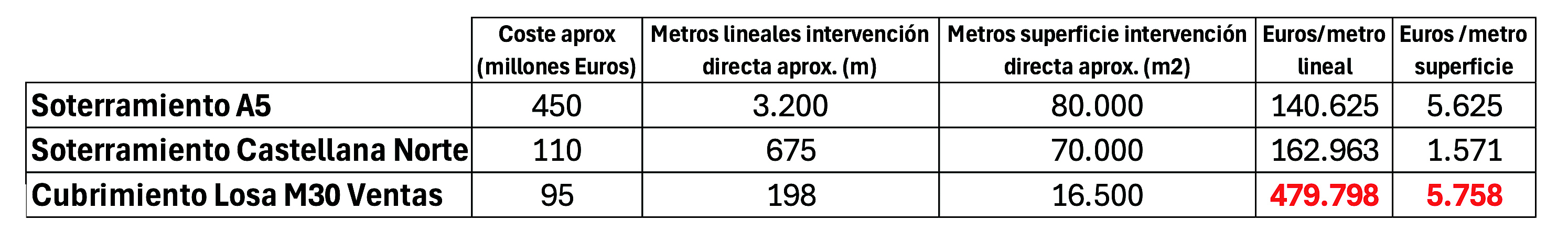 Se analice por donde se analice, metros lineales/coste, metros superficie/coste o presupuesto, el coste de la losa de la M-30 en Ventas multiplica, de forma exagerada e incomprensible, los valores de las otras dos obras, aun siendo la menos extensa y la de menor complejidad (ver tabla).