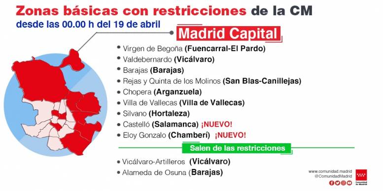 A partir de las 00:00 horas del lunes 19 de abril y hasta las 00:00 horas del lunes 3 de mayo quedarán restringidas las zonas básicas de salud de Madrid capital de Castelló (distrito de Salamanca), Eloy Gonzalo (Chamberí); y la ZBS de Majadahonda, en Majadahonda, por lo que quedará cerrado todo este municipio porque ya tenía restricciones la zona de Valle de la Oliva.