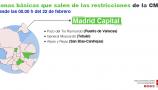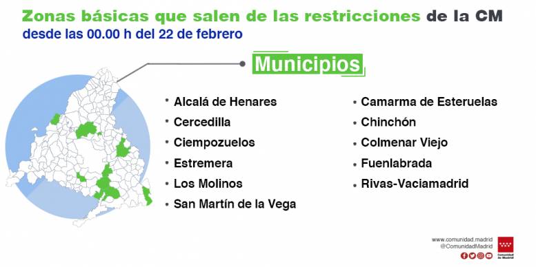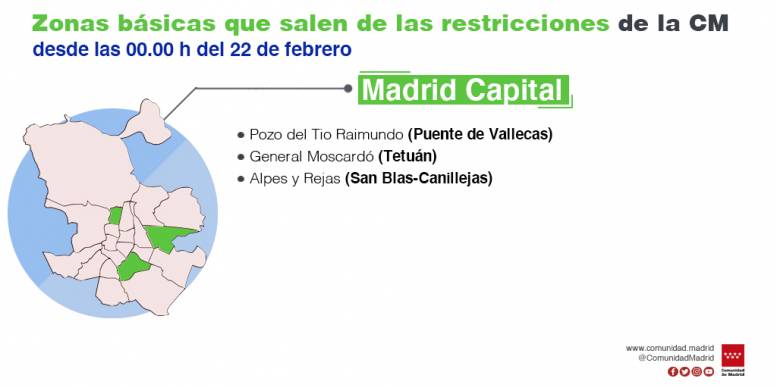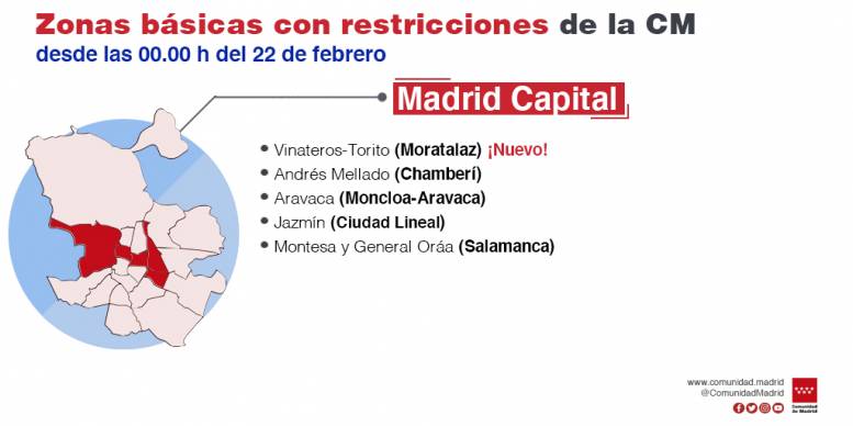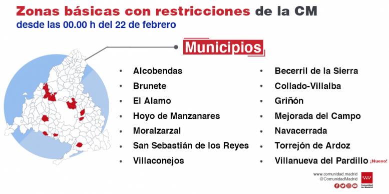 Por otro lado, se mantienen las restricciones de movilidad de entrada y salida hasta las 00:00 horas del lunes 1 de marzo, salvo por causa justificada, en todo el municipio de Torrejón de Ardoz, Collado Villalba, Alcobendas, San Sebastián de los Reyes, en la zona básica de Moralzarzal, en la zona básica de Getafe Norte y en las zonas básicas de Madrid capital de Andrés Mellado (Chamberí), Aravaca (Moncloa-Aravaca), Montesa y General Oraá (Salamanca) y Jazmín (Ciudad Lineal).