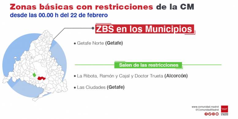 - También se levantan las restricciones en las zonas de La Ribota, Ramón y Cajal y Doctor Trueta en Alcorcón; Las Ciudades en Getafe; y Pozo del Tío Raimundo, General Moscardó, Alpes y Rejas, todas en Madrid capital