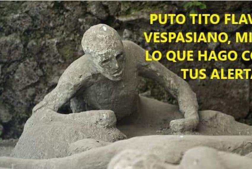 Luego resultó que en Madrid, a partir de la recepción del mensaje, no llovió tanto como se esperaba (de hecho por donde yo estaba llovió muchísimo más el día antes). Ello y la aparatosidad de la medida motivó que lo que de verdad llovieran fueran las críticas y las coñas (dos “deportes” muy de nuestra tierra, ¿o no?). Las primeras con argumentos estrambóticos como que tendrían que enviar esos mensajes solo a quienes los solicitasen (quien haya dicho eso no sabe lo que es una alerta ni para qué sirve), que lo que se pretende con eso es tenernos asustados (hombre, el susto es un resultado natural cuando te advierten de un riesgo serio. En cambio, si no te advierten el resultado natural puede ser la muerte. ¿Qué prefieren?) o que se trata de un experimento de control social (ya he comentado esto en un paréntesis del párrafo anterior, permítanme no repetirme). En cuanto a las segundas, la verdad es que la cosa ha dado para chistes y memes gloriosos, como el del cadáver cubierto de lava de las ruinas de Pompeya que parece sujetar un móvil y dice “Tito Flavio Vespasiano, mira lo que hago con tus alertas”. En este caso, buenas risas que nos hemos ganado, así que estupendo.